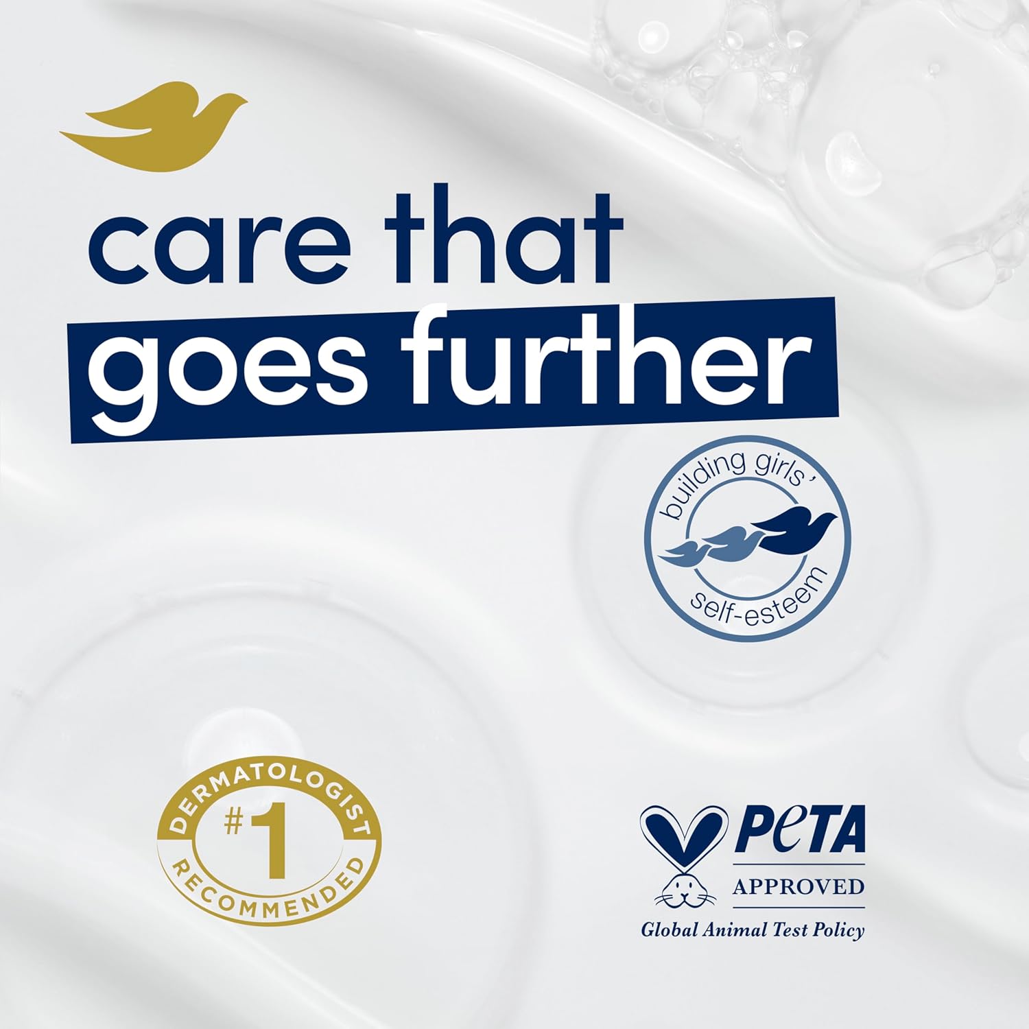 • CARE WITH YOUR CLEANSER: Globally, Dove does not test on animals and is PETA Approved. Our mission is to help the next generation of women develop a positive relationship with the way they look.